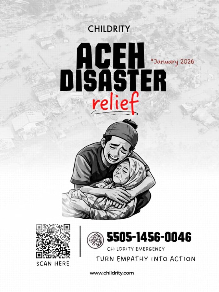 In November–December 2025, cyclone-induced floods and landslides struck Aceh and parts of northern Sumatra extremely hard. These disasters have killed thousands of people, displaced hundreds of thousands across Aceh, North Sumatra, and West Sumatra, and destroyed over 186,000 infrastructure and homes. This early January 2026, the Childrity team will be travelling to Aceh for a post-flood humanitarian mission. Alongside our dedicated volunteers and in collaboration with Citaglobal Berhad, we aim to bring relief through hot meals, food parcels, drinking water, cleaning kits, hygiene kits, and Happy Kits for affected children. Together, let’s lighten the burden of those affected by the floods and help them smile again.